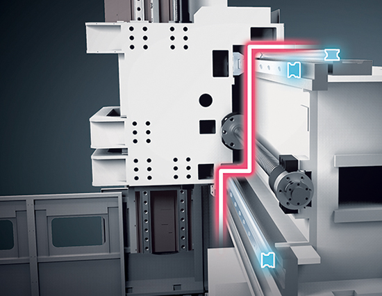 大尺寸橫梁采用段差式三線軌設(shè)計(jì),支撐剛性較傳統(tǒng)平行式軌道優(yōu)異甚多,有效避免頭部自重懸垂,顯著提升本系列重切削能力并維持長時間的超高精度